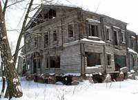 От остановки маршрутного такси мы пошли на восток, через остатки белокаменных ворот усадьбы, построенных в начале XIX в. Сразу за воротами - главный дом усадьбы, до неузнаваемости искаженный позднейшими перестройками. Дом находится в аварийном состоянии, но, кажется, в нем еще живут. Он, как и ворота, был построен в начале XIX в., при Мусине-Пушкине.