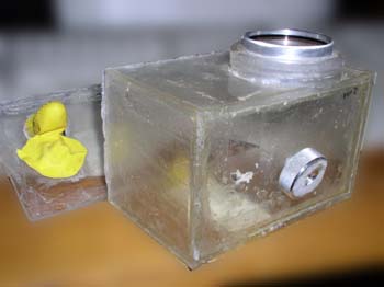 20 февраля 2005 г. в Никитской каменоломне успешно прошли испытания самодельного гермобокса для цифровой камеры Olympus CAMEDIA C-4000. С некоторыми переработками эта конструкция может быть использована и для любой другой камеры, поэтому точные размеры сознательно не приводятся. Общая стоимость конструкции составила около 8$ (покупался штативный болт, прозрачный светофильтр, крышечка для объектива и пара латексных перчаток).